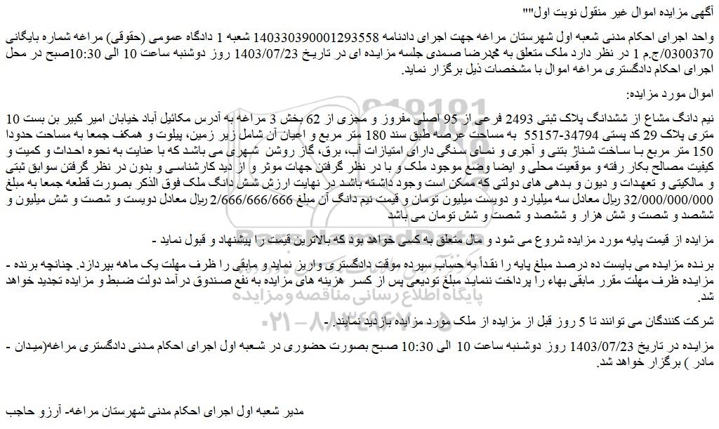 - مزایده در تاریخ 1403/07/23 روز دوشنبه ساعت 10 الی 10:30 صبح بصورت حضوری در شعبه اول اجرای احکام مدنی دادگستری مراغه(میدان مادر ) برگزار خواهد شد.