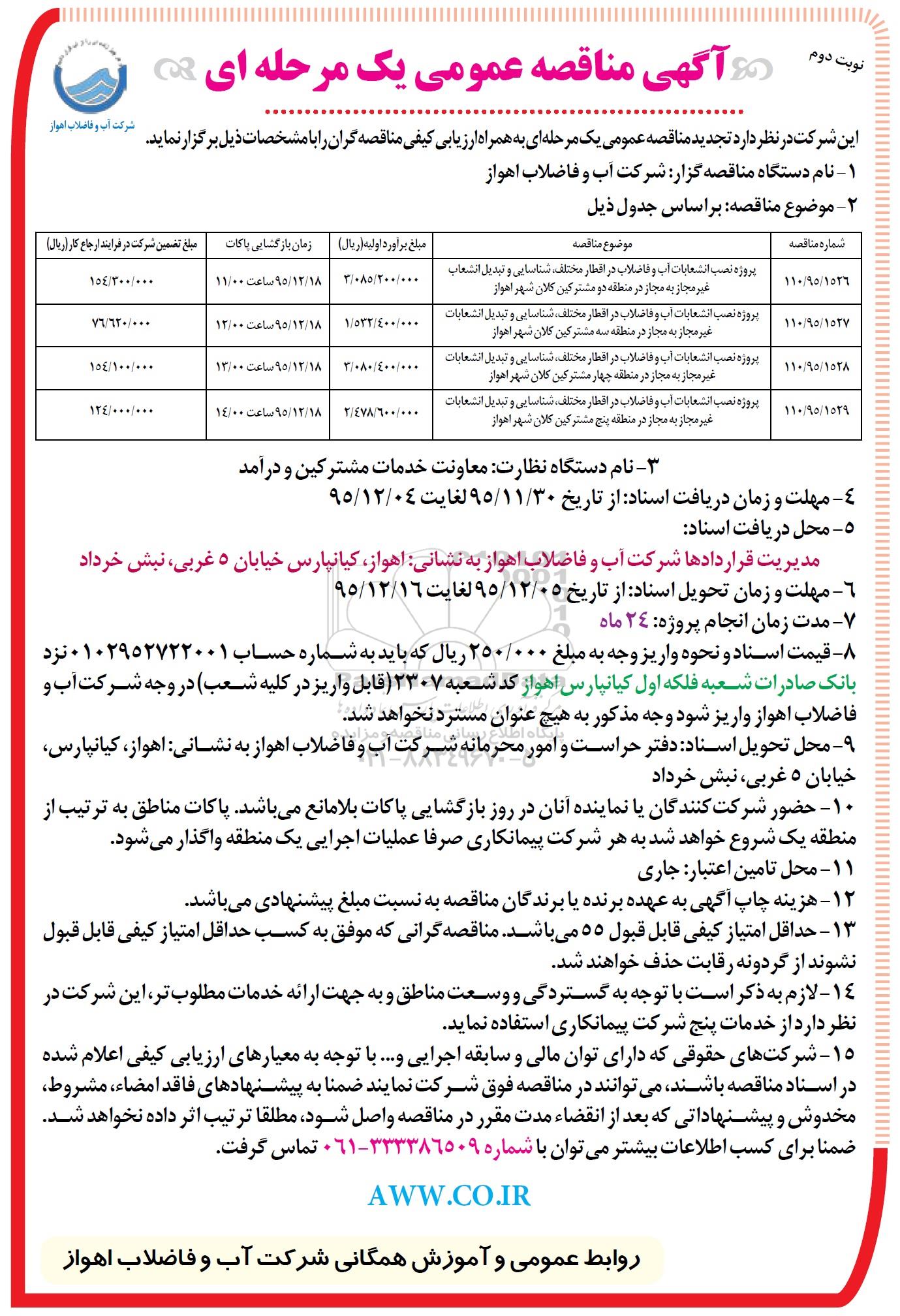 | 110/95/1528 | پروژه نصب انشعابات آب و فاضلاب در اقطار مختلف + شناسایی و تبدیل انشعابات غیرمجاز به مجاز در منطقه چهار مشترکین کلان شهر اهواز | 3.080.400.000 |
