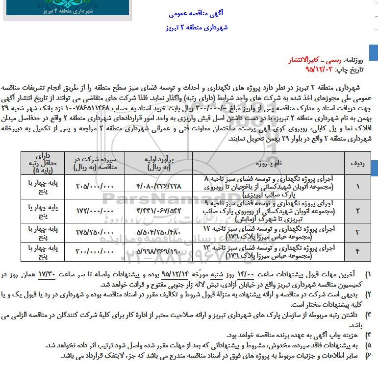 آگهی مناقصه عمومی ردیف نام پـروژه برآورد اولیه (به ریال) سپرده شرکت در مناقصه (به ریال) دارای حداقل رتبه (پایه 5) 1 اجرای پروژه نگهداری و توسعه فضای سبز ناحیه 8 (مجموعه اتوبان شهیدکسائی از یاغچیان تا روبروی پارک صائب تبریزی) 4/080/336/228 205/000/000 پایه چهار یا پنج 2 اجرای پروژه نگهداری و توسعه فضای سبز ناحیه 9 (مجموعه اتوبان شهیدکسائی از روبروی پارک صائب تبریزی تا شهرک آزمایش) 3/431/067/542 172/000/000 پایه چهار یا پنج 3 اجرای پروژه نگهداری و توسعه فضای سبز ناحیه 12 (مجموعه عباس میرزا پلاک 179) 5/504/250/480 275/250/000 پایه چهار یا پنج 4 اجرای پروژه نگهداری و توسعه فضای سبز ناحیه 13 (مجموعه عباس میرزا پلاک 179) 5/998/369/190 300/000/000 پایه چهار یا پنج