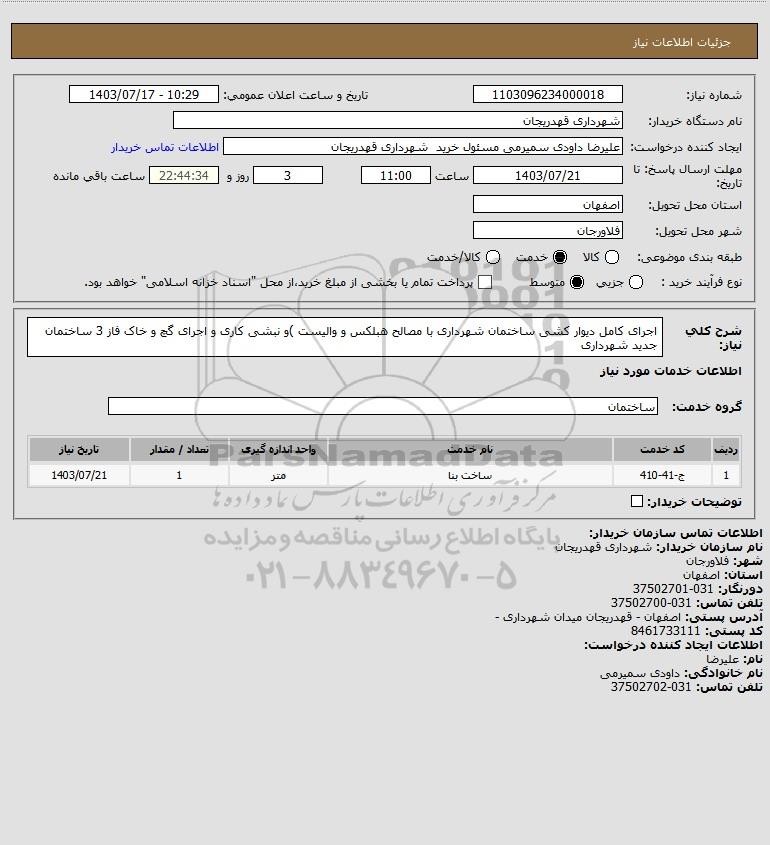 شرح کلی نیاز: اجرای کامل دیوار کشی ساختمان شهرداری با مصالح هبلکس و والیست )و نبشی کاری و اجرای گچ و خاک فاز 3 ساختمان جدید شهرداری