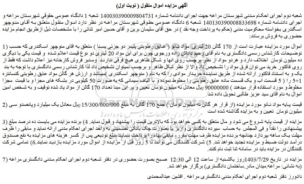 1) اموال مورد مزایده عبارت است از 170 گالن 20 لیتری مواد نانو ( عایق رطوبتی پلیمر دو جزئی یسنا ) متعلق به اقای منوچهر اسکندری که حسب توضیحات کارشناس رسمی دادگستری به نام آقای رحیم داداش زاده ورجوی چون برای این مواد 20 لیتری دو نوع قیمت اعلام شده و قیمت یکی با دیگری ده میلیون تومان اختلاف دارد و هردو مواد از نظر برچسب روی انها و شکل ظاهری هیچ فرقی ندارند ومدیر فروش کارخانه نیز اعلام داشت که فقط از روی فاکتور خرید می توان فرق مواد را تشخیص داد والا از نظر شکل ظاهر و برچسب نمیتوان تشخیص داد لذا کارشناس رسمی دادگستری با توجه به بند یک و به استناد فاکتور ارائه شده از طریق نماینده خریدار موادی را که به نام ( منوچهر اسکندری )میباشد و ارزش هر گالن مواد عایق رطوبتی کنسانتره 1+5 را ( 5 قسمت اب و یک قسمت ماده عایق رطوبتی را مخلوط نموده و با الیاف سیمانی که به صورت 50 کیلویی در بشکه های مجزا و با قیمت مجزا مخلوط و مورد استفاده قرار میدهند ) 90000000 ریال معادل نه میلیون تومان تعیین و بر این مبنا تعداد 170 گالن از مواد یاد شده توقیف و به شخص امین اموال به نام اقای سید عزیز طالبی تحویل داده شد