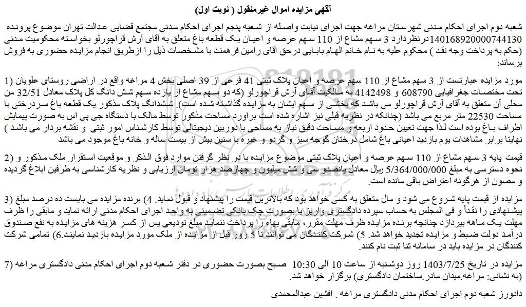 شعبه دوم اجرای احکام مدنی شهرستان مراغه جهت اجرای نیابت واصله از شعبه پنجم اجرای احکام مدنی مجتمع قضایی عدالت تهران موضوع پرونده 140168920000744130درنظردارد 3 سهم مشاع از 110 سهم عرصه و اعیان یک قطعه باغ متعلق به آقای آرش قراچورلو بخواسته محکومیت مدنی (حکم به پرداخت وجه نقد ) محکوم علیه به نام خانم الهام بابایی درحق آقای رامین فرهمند با مشخصات ذیل را ازطریق انجام مزایده حضوری به فروش برساند: