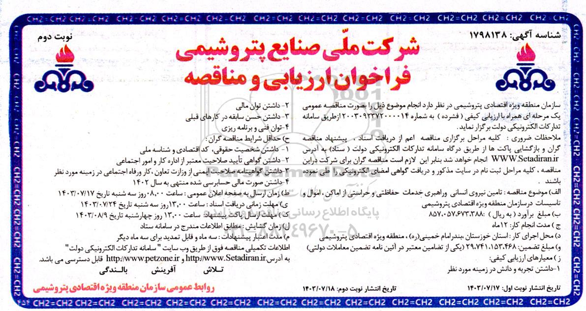 فراخوان ارزیابی کیفی و مناقصه تامین نیروی انسانی و راهبری خدمات حفاظتی و حراستی -نوبت دوم, فراخوان ارزیابی کیفی و مناقصه تامین نیروی انسانی و راهبری خدمات حفاظتی و حراستی -نوبت دوم