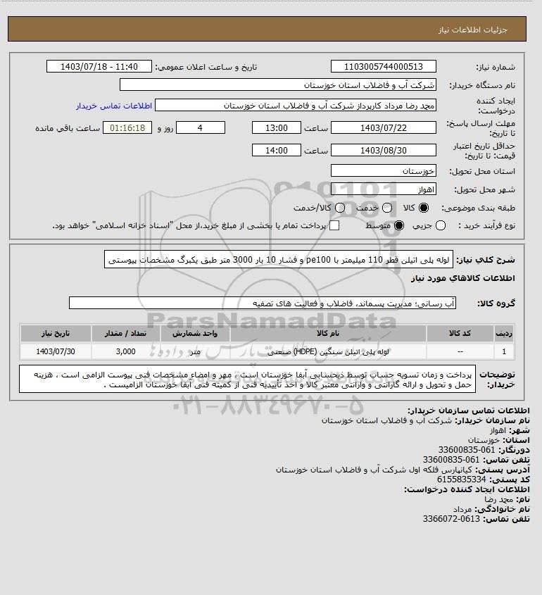شرح کلی نیاز: لوله پلی اتیلن قطر 110 میلیمتر با pe100 و فشار 10 بار 3000 متر طبق یکبرگ مشخصات پیوستی