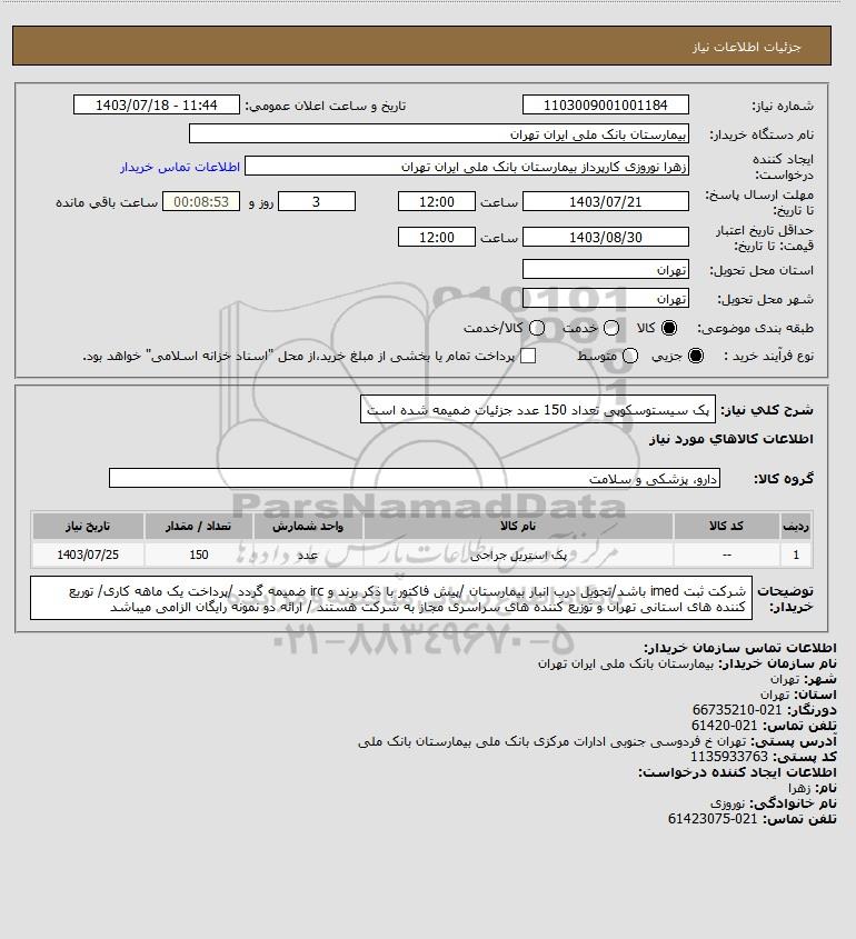 نام سازمان خریدار: بیمارستان بانک ملی ایران تهران