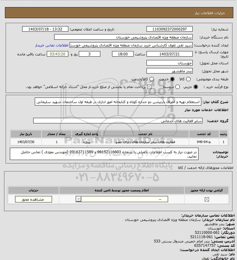 شرح کلی نیاز: استعلام تهیه و اجرای پارتیشن دو جداره کوتاه و کتابخانه امور اداری در طبقه اول ساختمان شهید سلیمانی