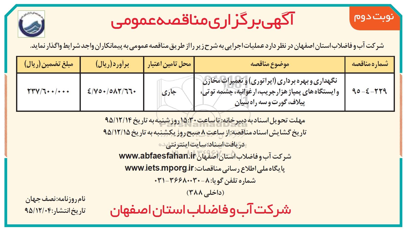 شرکت آب و فاضلاب استان اصفهان در نظر دارد عملیات اجرایی به شرح زیر را از طریق مناقصه عمومی به پیمانکاران واجد شرایط واگذار نماید.