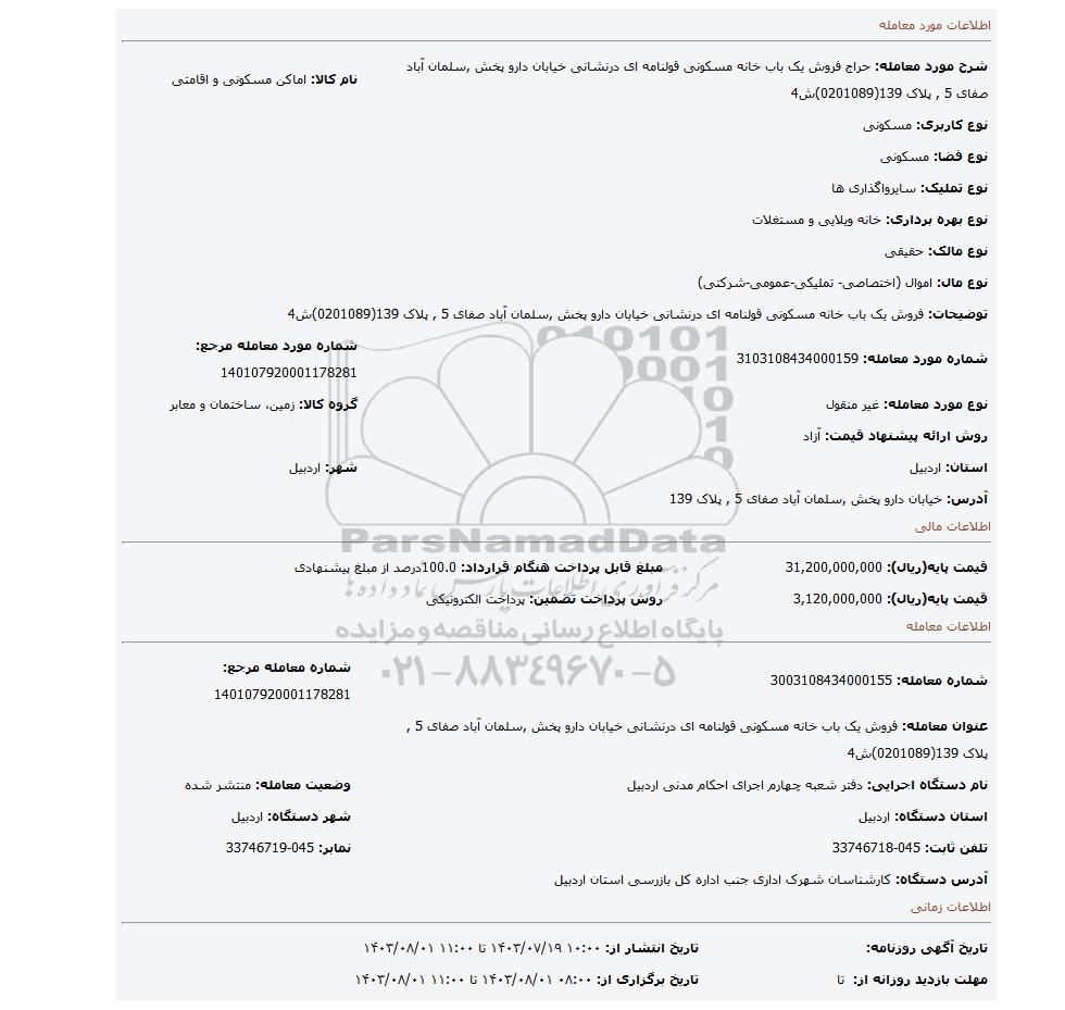 شماره مورد معامله: 3103108434000159 | شماره مورد معامله مرجع: 140107920001178281 | |
