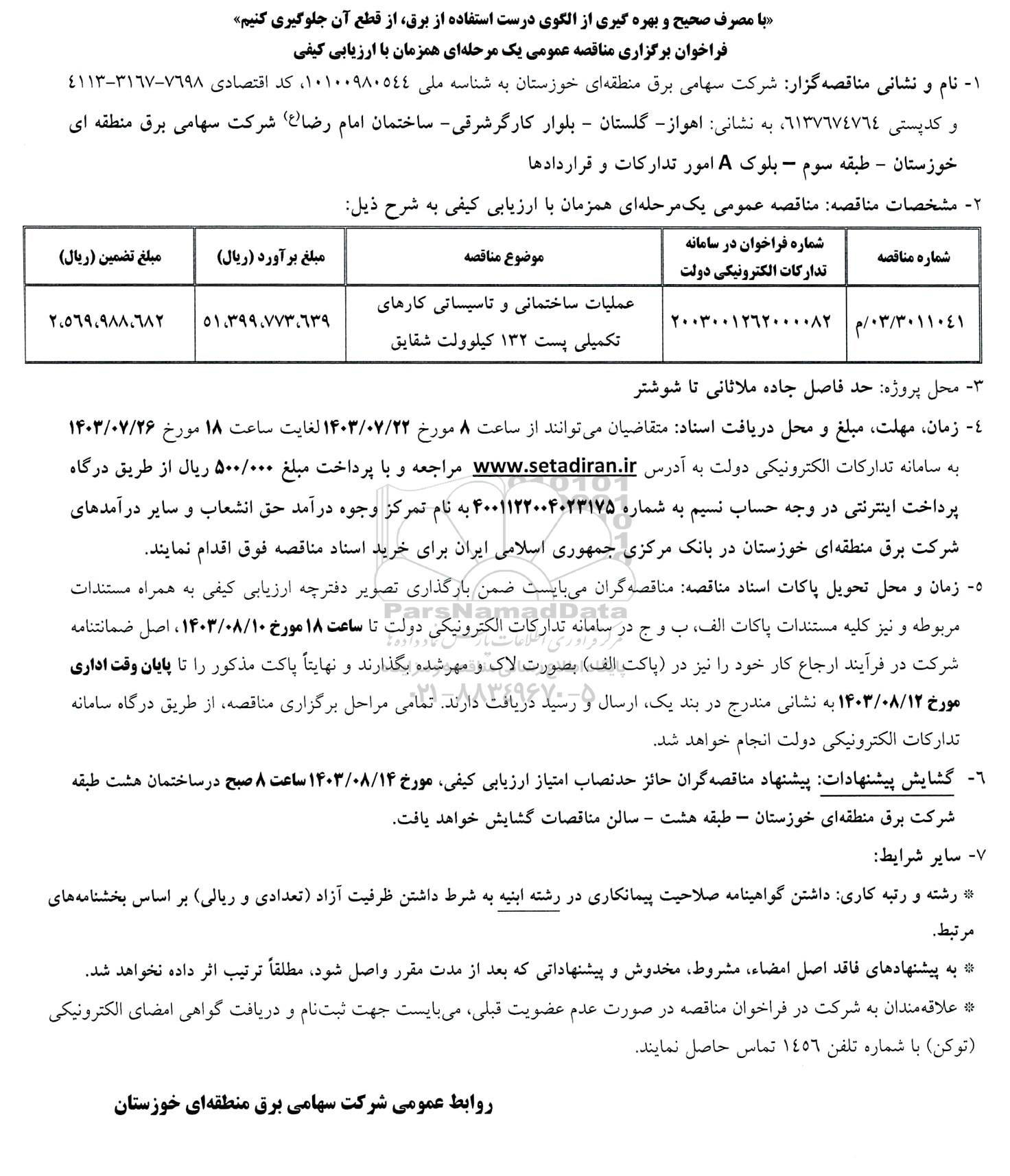 مناقصه عملیات ساختمانی و تاسیساتی کارهای تکمیلی پست 132 کیلوولت شقایق, مناقصه عملیات ساختمانی و تاسیساتی کارهای تکمیلی پست 132 کیلوولت شقایق