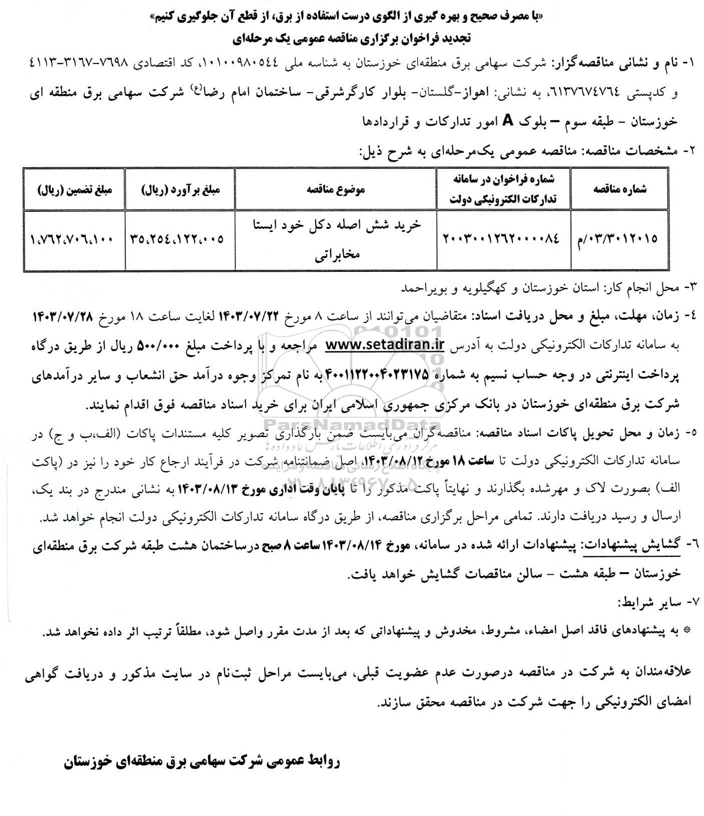 6- گشایش پیشنهادات پیشنهادات ارائه شده در سامانه مورخ8.146.19 ساعت 8 صبح ساختمان هشت طبقه شرکت برق منطقه ای خوزستان - طبقه هشت - سالن مناقصات گشایش خواهد یافت.