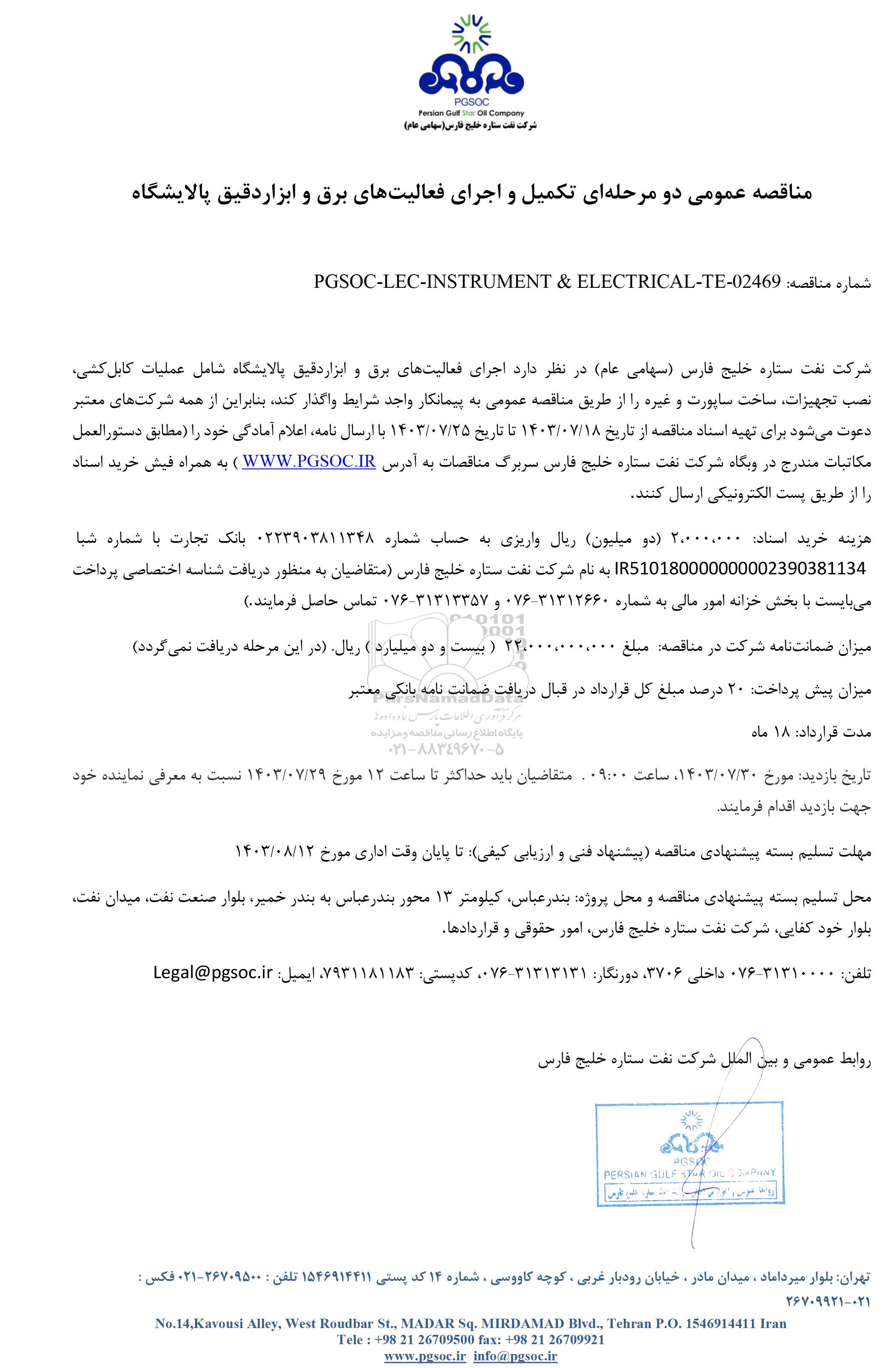 شماره مناقصه: PGSOC-LEC-INSTRUMENT & ELECTRICAL-TE- 02469