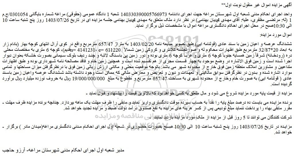 - مزایده در تاریخ 1403/07/26 روز پنج شنبه ساعت 10 الی 10:30 صبح بصورت حضوری در شعبه اول اجرای احکام مدنی دادگستری مراغه(میدان مادر ) برگزار خواهد شد.