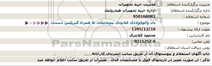 استعلام بها و موضوع استعلام استعلام ، استعلام بال والوفولادی فلانچی پنوماتیكی به اطلاع کلیه شرکتها و افراد متخصص واجد شرایط میرساند، آگهی گذار در نظر دارد از طریق استعلام بها، نسبت به انتخاب و دریافت پیشنهادات اقدام نماید. این استعلام با کد آگهی ثبت شده در سامانه خبرگزاری پارس نماد : 811617 منتشر شده است. مشخصات استعلام : تاریخ شروع استعلام: 1395/12/05 آخرین مهلت ارسال پیشنهاد قیمت : 1395/12/10 و محل اجرای پروژه : استان اصفهان میباشد. استعلام قیمت مورد درخواست : استعلام ، استعلام بال والوفولادی فلانچی پنوماتیكی با دستهبندیهای تخصصی و گروه های مرتبط : شیرآلات, دستگاه ها و تجهیزات هیدرولیک و پنوماتیک, استعلام اطلاع رسانی میگردد.