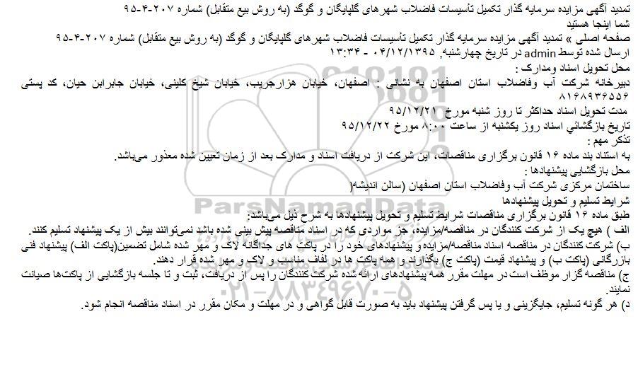 تمدید آگهی مزایده سرمایه گذار تکمیل تأسیسات فاضلاب شهرهای گلپایگان و گوگد (به روش بیع متقابل) شماره 207-4-95
