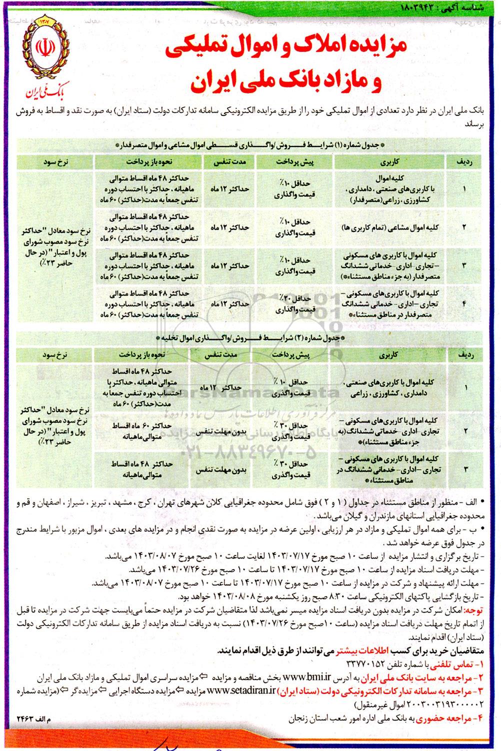 مزایده املاک و اموال تملیکی و مازاد بانک ملی ایران