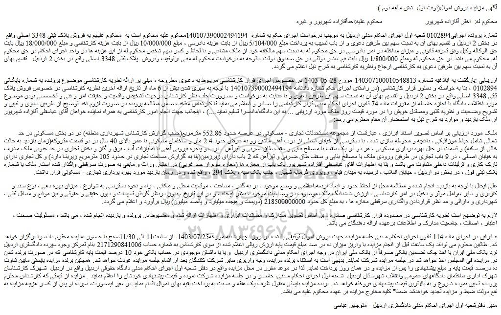 شماره پرونده اجرایی0102894 شعبه اول اجرای احکام مدنی اردبیل به موجب درخواست اجرای حکم به شماره 140107390002494194محکوم علیه محکوم است به محکوم علیهم به فروش پلاک ثبتی 3348 اصلی واقع در بخش 2 اردبیل و تقسیم بهای آن به نسبت سهم بین طرفین دعوی و از باب تسبیب به پرداخت مبلغ 5/104/000 ریال از بابت هزینه دادرسی ، مبلغ 10/000/000 ریال از بابت هزینه کارشناسی و مبلغ 18/000/000 ریال بابت حق الوکاله وکیل وفق تعرفه قانونی و میزان مداخله در امر دادرسی در حق محکوم له به نسبت سهم مالکانه خود از ملک مشاعی و با لحاظ و کسر سهم شخص محکوم له از این هزینه ها در واحد اجرای احکام در حق محکوم له، محکوم می باشد.در حق محکوم له ومبلغ 1/800/000 ریال بابت نیم عشر دولتی در حق صندوق دولت ،باتوجه به درخواست محکوم له مبنی برتوقیف وفروش پلاک ثبتی 3348 اصلی واقع در بخش 2 اردبیل تقسیم بهای آن به نسبت سهم بین طرفین دعوی به کارشناسی ارجاع ونظریه کارشناسی به شرح ذیل اعلام می گردد.