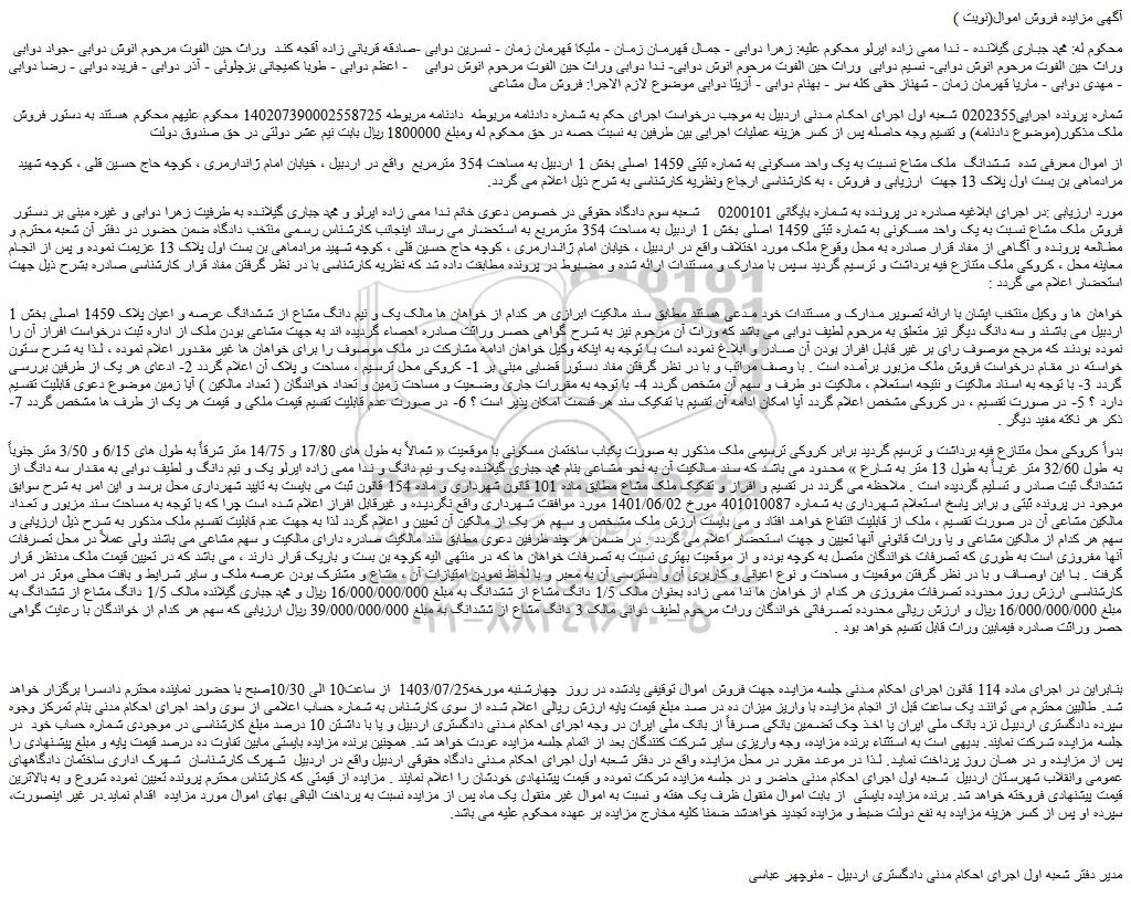 شماره پرونده اجرایی0202355 شعبه اول اجرای احکام مدنی اردبیل به موجب درخواست اجرای حکم به شماره دادنامه مربوطه دادنامه مربوطه 140207390002558725 محکوم علیهم محکوم هستند به دستور فروش ملک مذکور(موضوع دادنامه) و تقسیم وجه حاصله پس از کسر هزینه عملیات اجرایی بین طرفین به نسبت حصه در حق محکوم له ومبلغ 1800000 ریال بابت نیم عشر دولتی در حق صندوق دولت