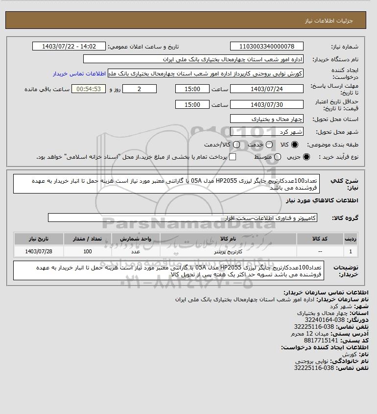 شرح کلی نیاز: تعداد100عددکارتریج چاپگر لیزری HP2055 مدل 05A با گارانتی معتبر مورد نیاز است هزینه حمل تا انبار خریدار به عهده فروشنده می باشد