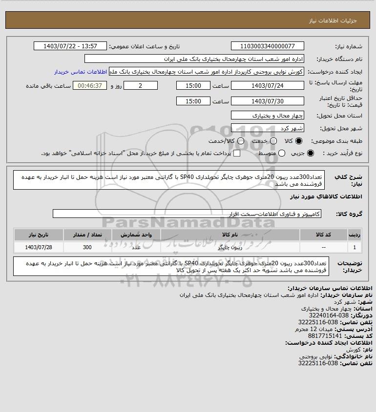 شرح کلی نیاز: تعداد300عدد ریبون 20متری جوهری چاپگر تحویلداری SP40 با گارانتی معتبر مورد نیاز است هزینه حمل تا انبار خریدار به عهده فروشنده می باشد