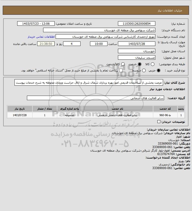 شرح کلی نیاز: مرمت بخشی از ساختمان قدیمی امور بهره برداری شمال شرق و اتاق حراست ورودی محوطه به شرح خدمات پیوست
