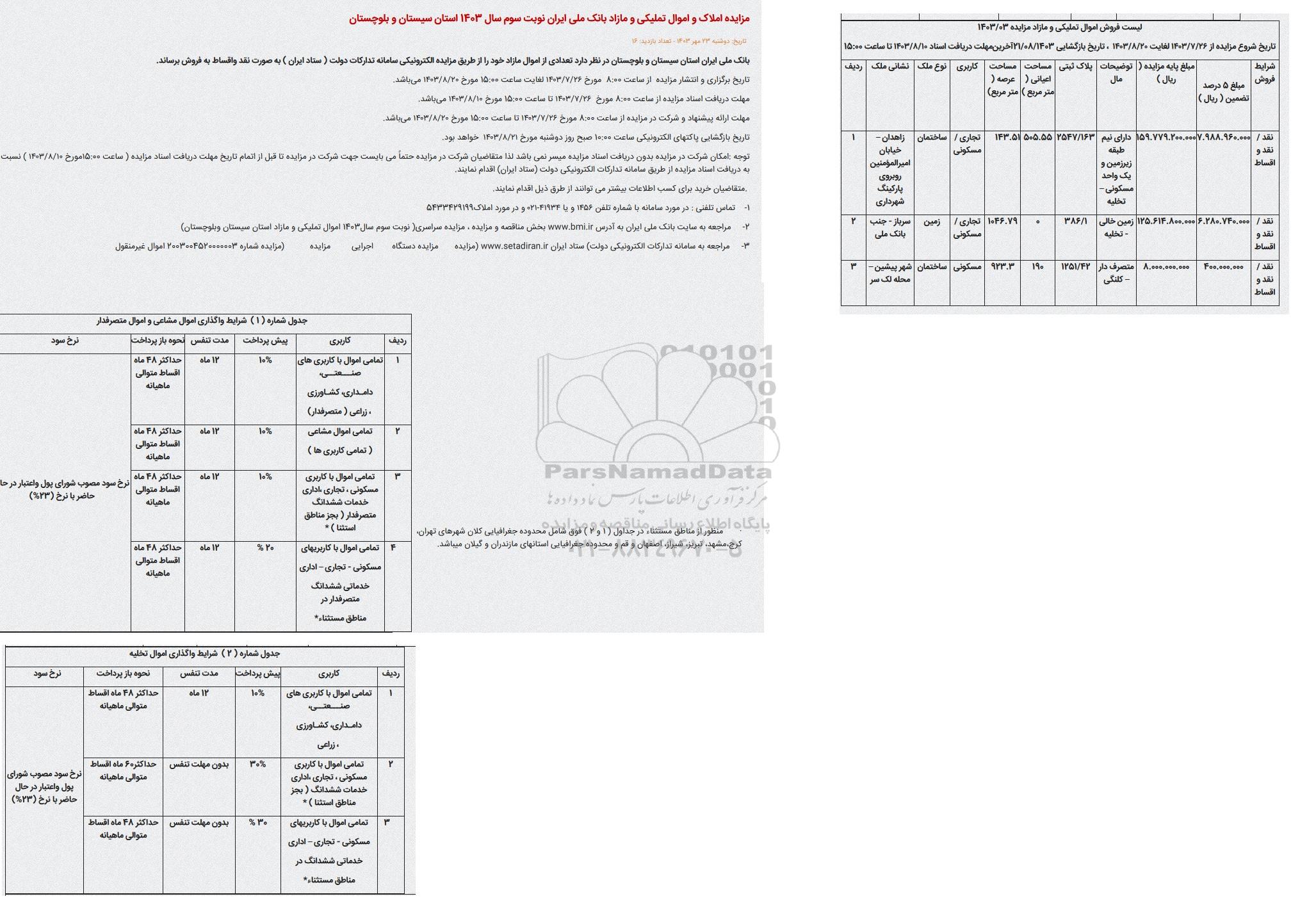 مزایده املاک و اموال تملیکی و مازاد بانک ملی نوبت سوم سال 1403 استان سیستان و بلوچستان ؟