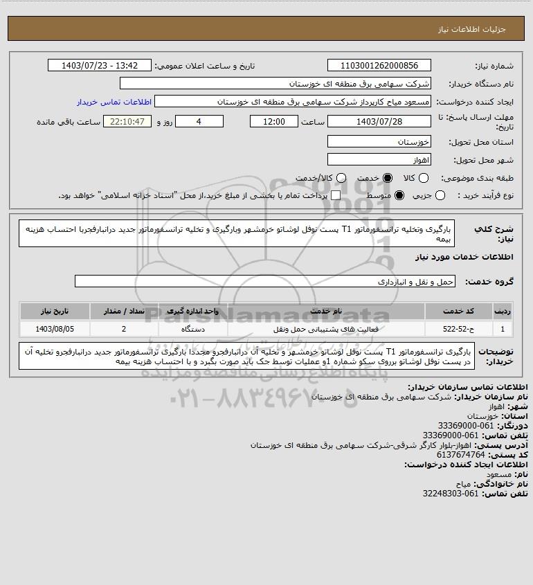 استعلام بارگیری وتخلیه ترانسفورماتور T1 پست نوفل لوشاتو خرمشهر وبارگیری و تخلیه ترانسفورماتور جدید درانبارفجربا احتساب هزینه بیمه, استعلام بارگیری وتخلیه ترانسفورماتور T1 پست نوفل لوشاتو خرمشهر وبارگیری و تخلیه ترانسفورماتور جدید درانبارفجربا احتساب هزینه بیمه