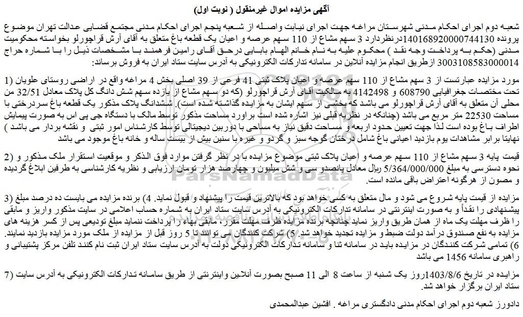 شعبه دوم اجرای احکام مدنی شهرستان مراغه جهت اجرای نیابت واصله از شعبه پنجم اجرای احکام مدنی مجتمع قضایی عدالت تهران موضوع پرونده 140168920000744130درنظردارد 3 سهم مشاع از 110 سهم عرصه و اعیان یک قطعه باغ متعلق به آقای آرش قراچورلو بخواسته محکومیت مدنی (حکم به پرداخت وجه نقد ) محکوم علیه به نام خانم الهام بابایی درحق آقای رامین فرهمند با مشخصات ذیل را با شماره حراج 3003108583000014 ازطریق انجام مزایده آنلاین در سامانه تدارکات الکترونیکی به آدرس سایت ستاد ایران به فروش برساند: