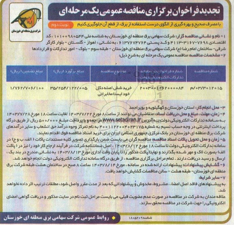 نام و نشانی مناقصه گزار: شرکت سهامی برق منطقه ای خوزستان به شناسه ملی 10100980544 کد اقتصادی 7698-3167-4113 و کدپستی 6137674764 به نشانی اهواز - گلستان - بلوار کارگر شرقی - ساختمان امام رضا (ع) شرکت سهامی برق منطقه ای خوزستان - طبقه سوم - بلوک A امور تدارکات و قراردادها