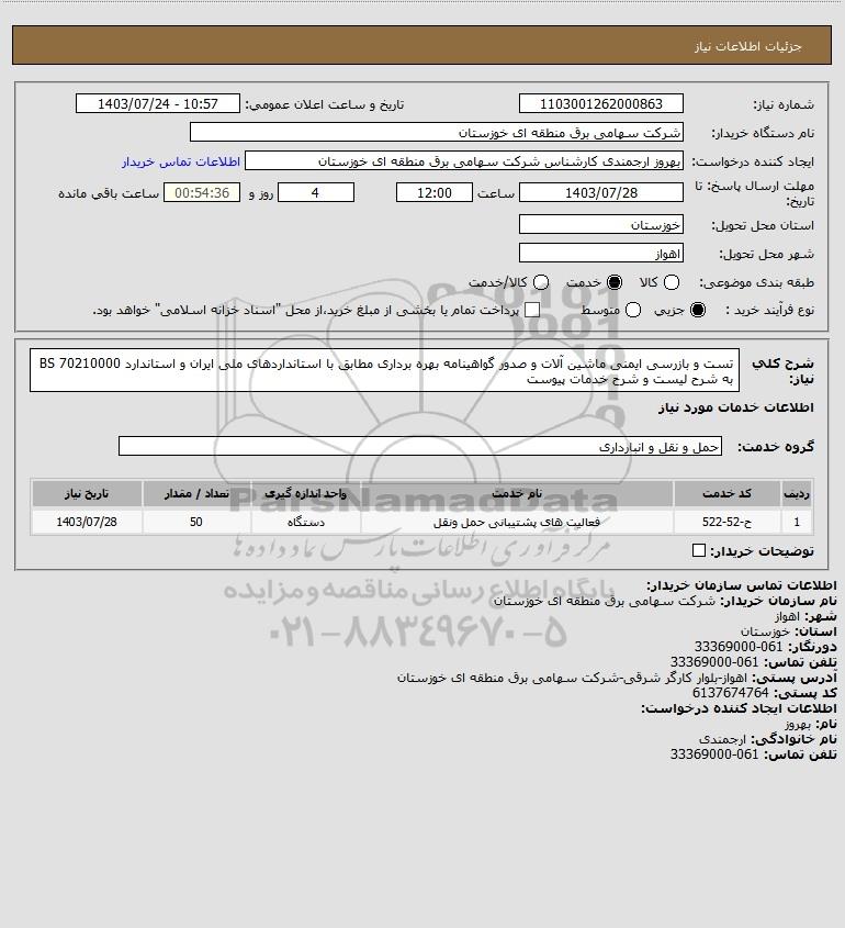 شرح کلی نیاز: تست و بازرسی ایمنی ماشین آلات و صدور گواهینامه بهره برداری مطابق با استانداردهای ملی ایران و استاندارد 70210000 BS به شرح لیست و شرح خدمات پیوست