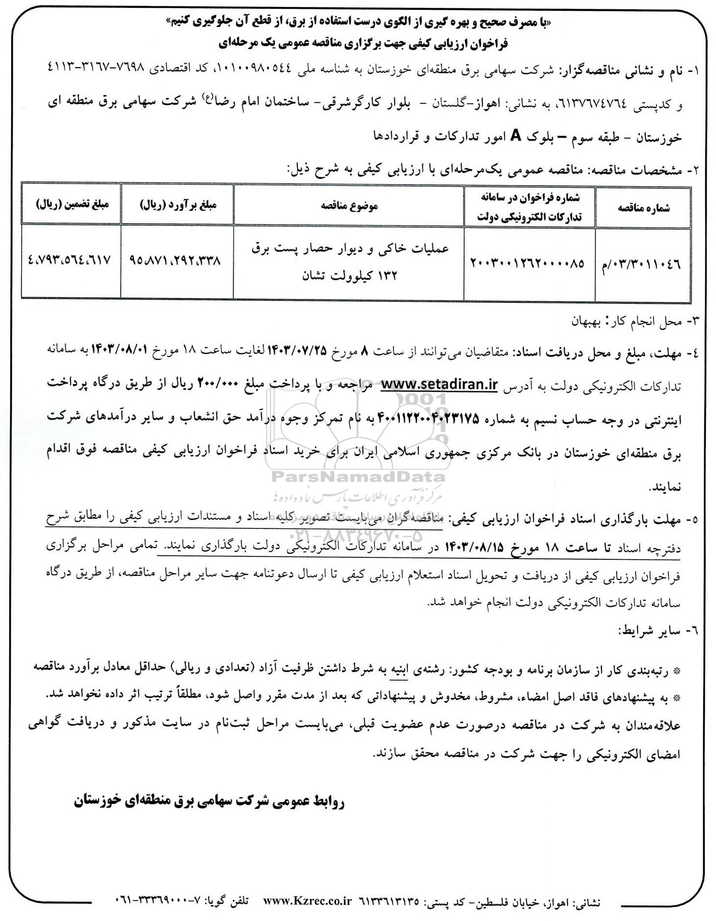 03/3011046/ م | 2003001262000085 | عملیات خاکی و دیوار حصار پست برق 132 کیلوولت نشان | 95.871.292.338 | 4.793.564.617 |