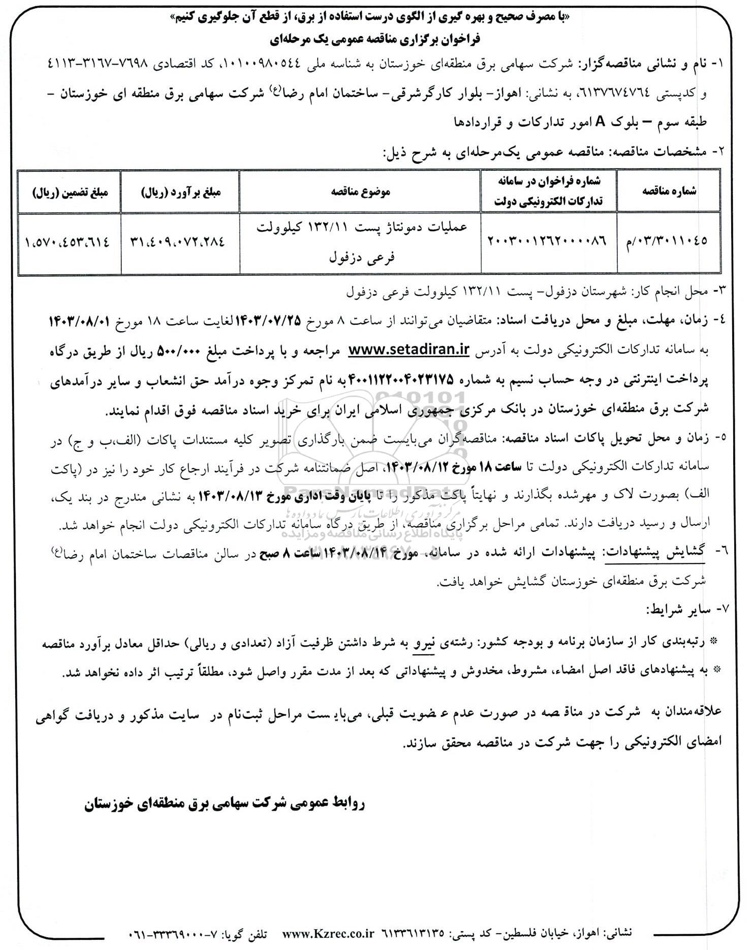 03/3011045/م    2003001262000086 عملیات دمونتاژ پست 132.11 کیلوولت فرعی دزفول  31.409.072.284 1.570.453.614