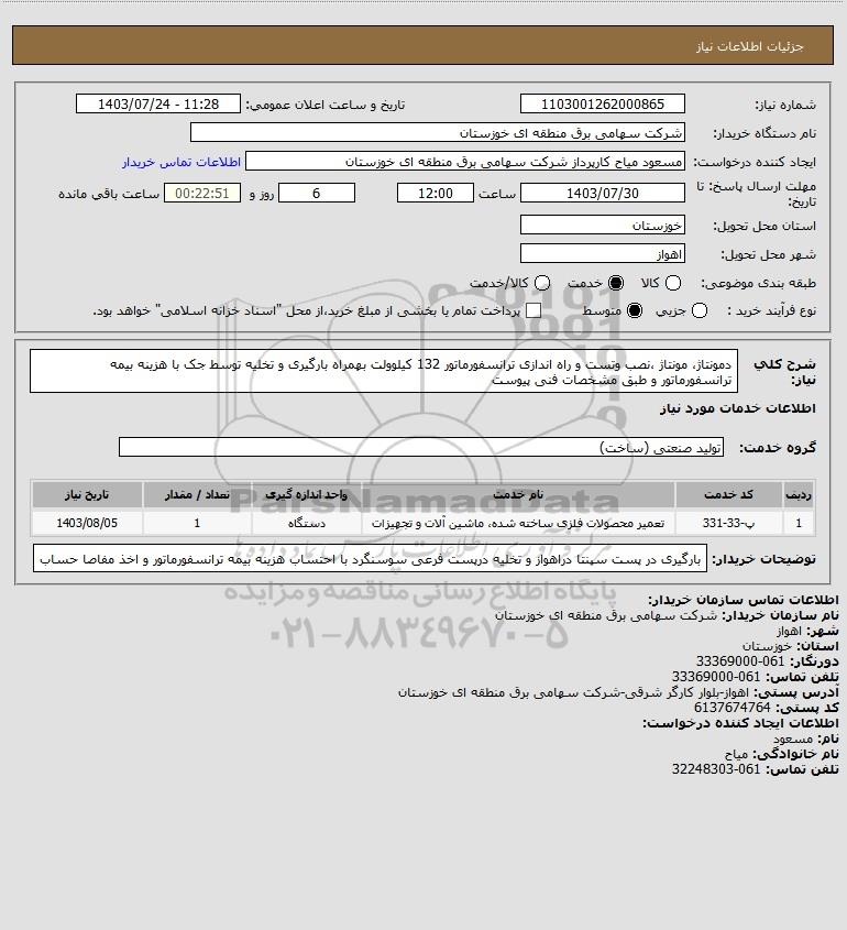 استعلام دمونتاژ مونتاژ نصب وتست و راه اندازی ترانسفورماتور 132 کیلوولت بهمراه بارگیری و تخلیه توسط جک با هزینه بیمه ترانسفورماتور و طبق مشخصات فنی پیوست, استعلام دمونتاژ، مونتاژ ،نصب وتست و راه اندازی ترانسفورماتور 132 کیلوولت بهمراه بارگیری و تخلیه توسط جک با هزینه بیمه ترانسفورماتور و طبق مشخصات فنی پیوست
