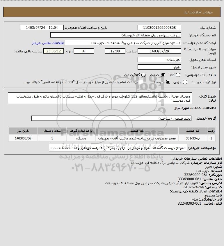 توضیحات خریدار:دمونتاژ درپست گلستان اهواز و مونتاژ درانبارفجر بهمراه بیمه ترانسفورماتور و اخذ مفاصا حساب