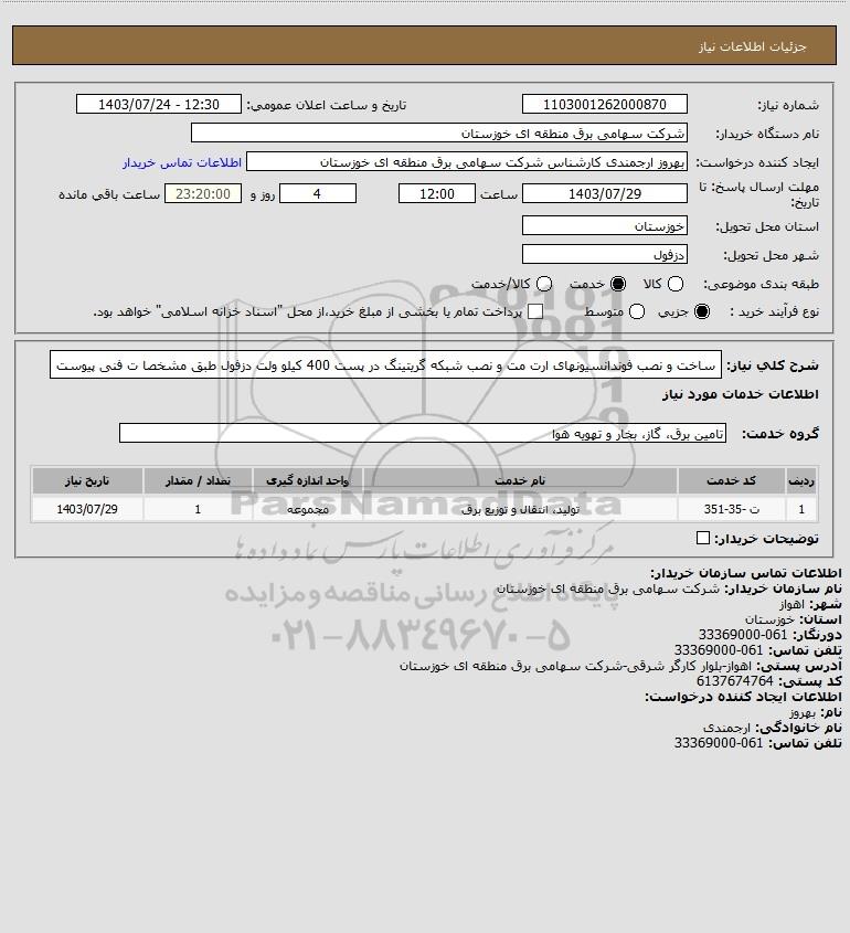 شرح کلی نیاز: ساخت و نصب فوندانسیونهای ارت مت و نصب شبکه گریتینگ در پست 400 کیلو ولت دزفول طبق مشخصا ت فنی پیوست