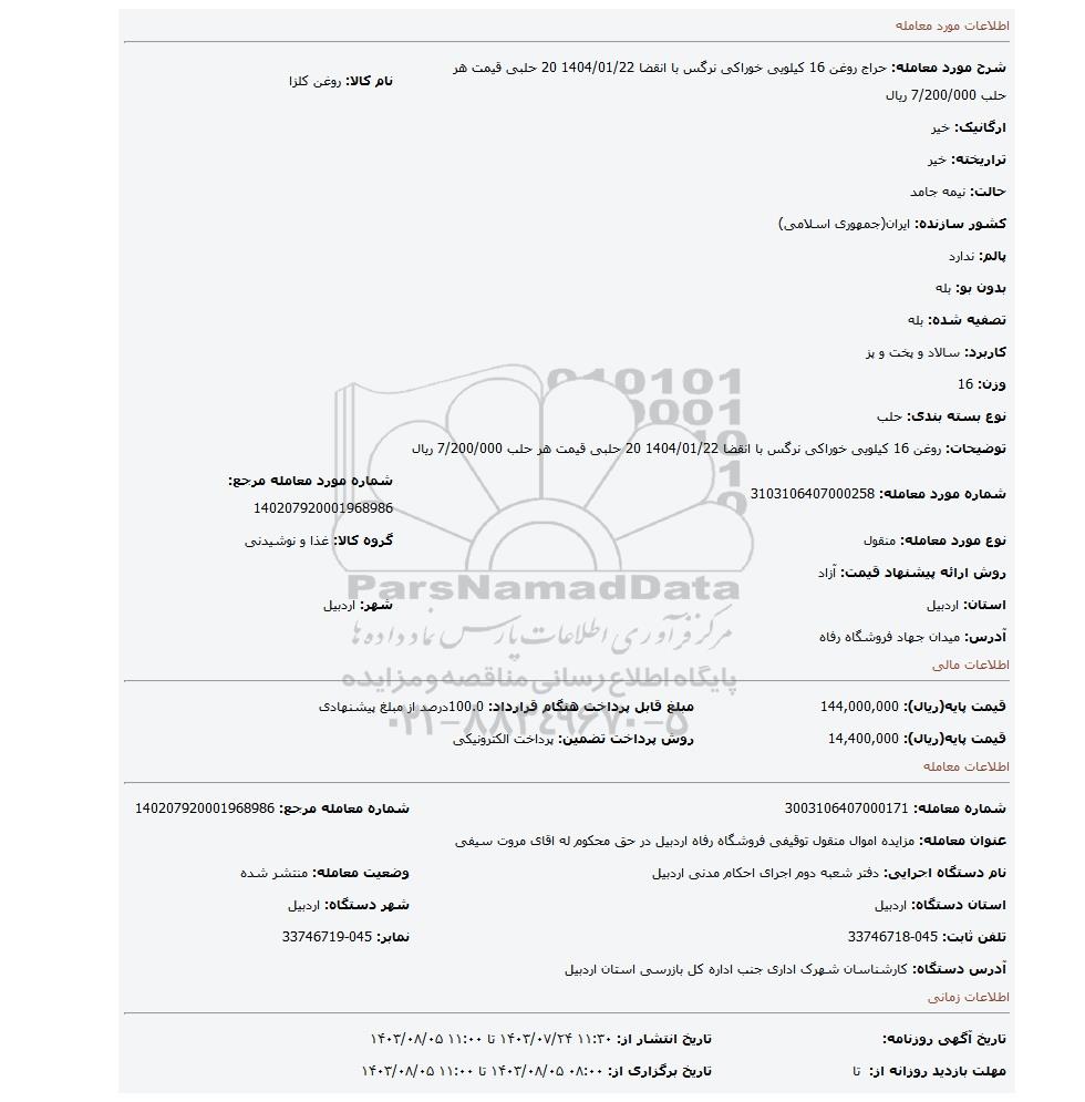 مزایده روغن 16 کیلویی خوراکی نرگس با انقضا 1404/01/22 20 حلبی قیمت هر حلب 7/200/000 ریال, مزایده، روغن 16 کیلویی خوراکی نرگس با انقضا 1404/01/22 20 حلبی قیمت هر حلب 7/200/000 ریال