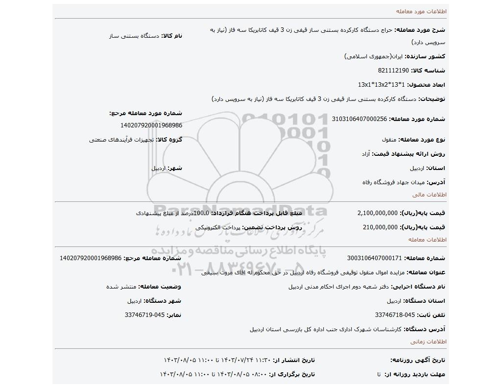 مکان برگزاری اموال واگذاری استانهای اردبیل و دستهبندیهای مربوط به این حراجی تجهیزات کارخانه ها و ماشین آلات صنعتی, تجهیزات آشپزخانه میباشد.