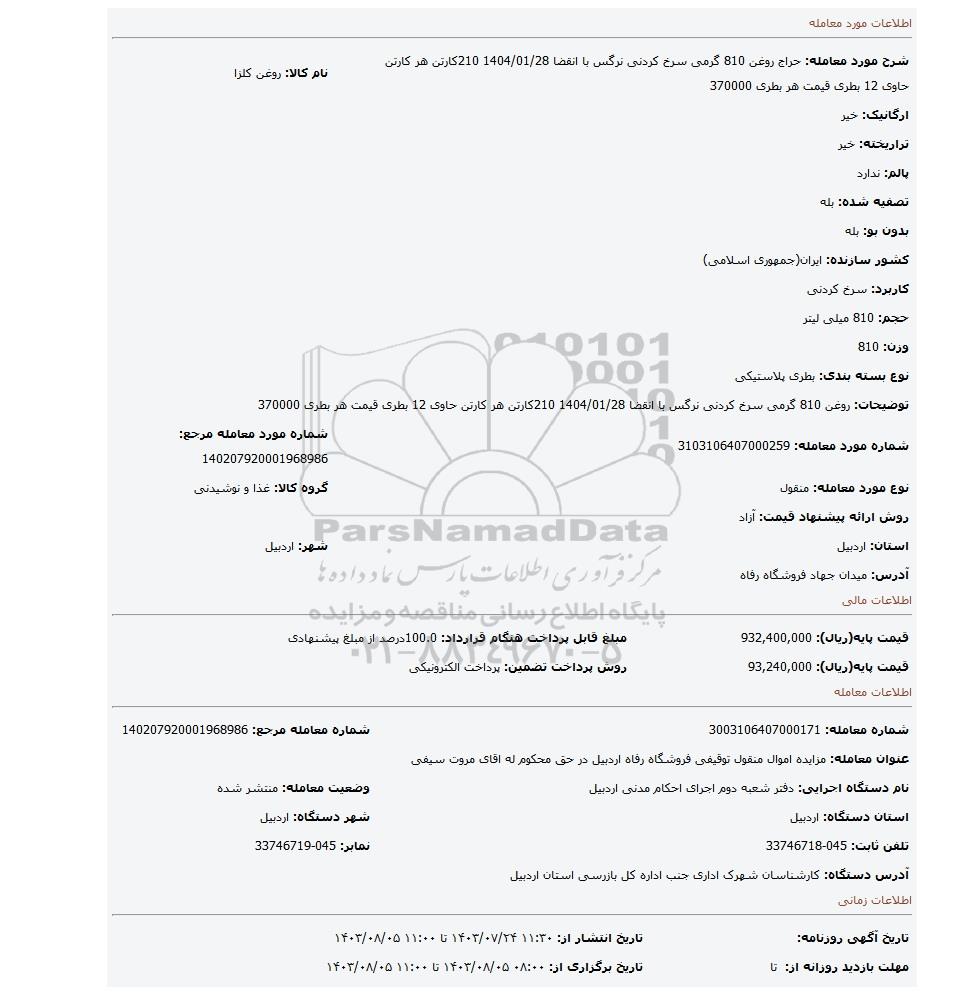 شماره مورد معامله: 3103106407000259شماره مورد معامله مرجع: 140207920001968986