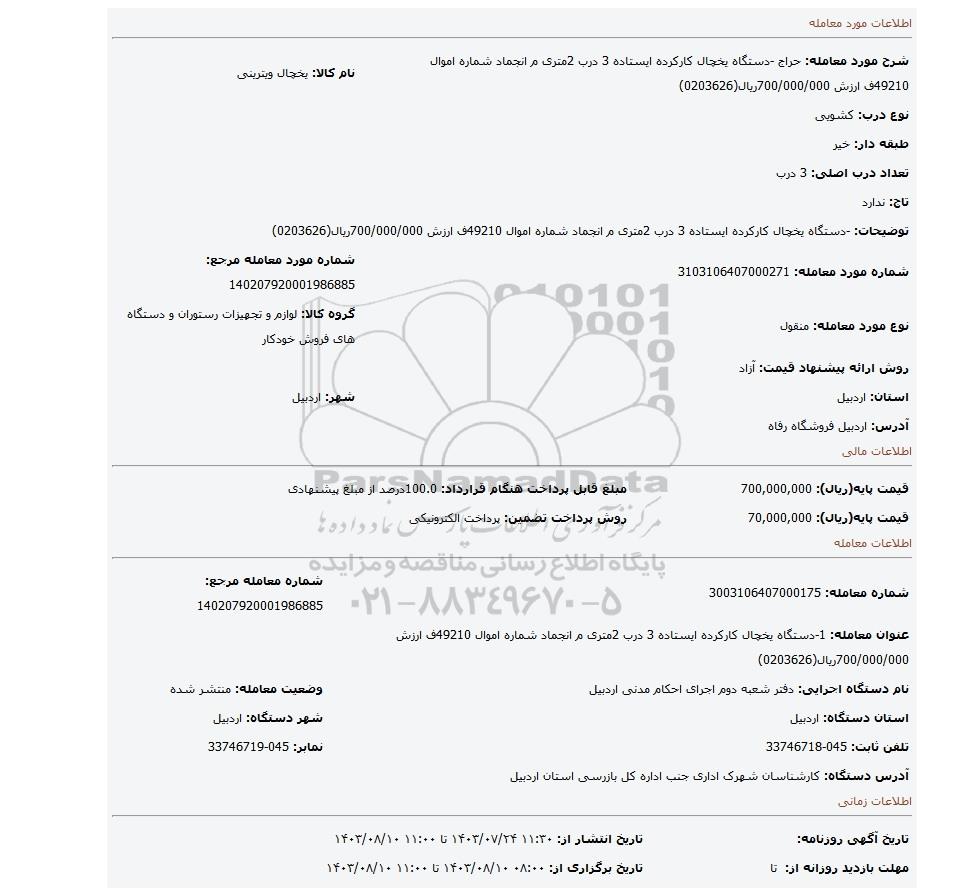 عنوان معامله: 1-دستگاه یخچال کارکرده ایستاده 3 درب 2متری م انجماد شماره اموال 49210ف ارزش 700/000/000ریال(0203626) | ||