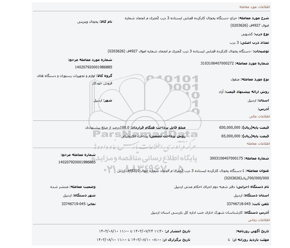 عنوان معامله: 1-دستگاه یخچال کارکرده ایستاده 3 درب 2متری م انجماد شماره اموال 49210ف ارزش 700/000/000ریال(0203626) | ||