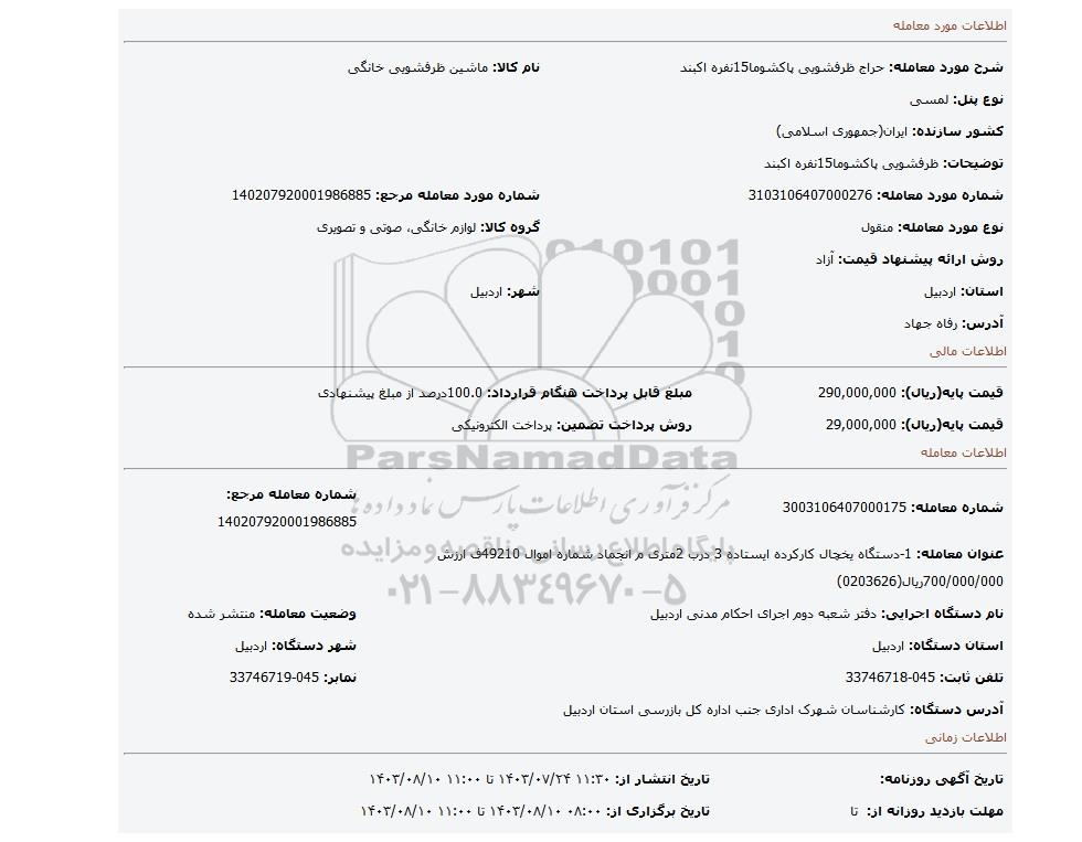 نام دستگاه اجرایی: دفتر شعبه دوم اجرای احکام مدنی اردبیل | وضعیت معامله: منتشر شده | |