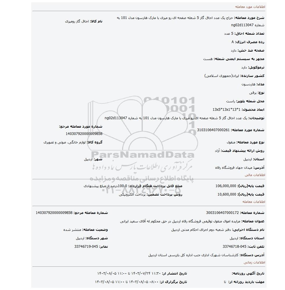 شرح مورد معامله: حراج یک عدد اجاق گاز 5 شعله صفحه ای رو میزی با مارک هارسون مدل 101 به شماره ng02d113047 | نام کالا: اجاق گاز رومیزی | |