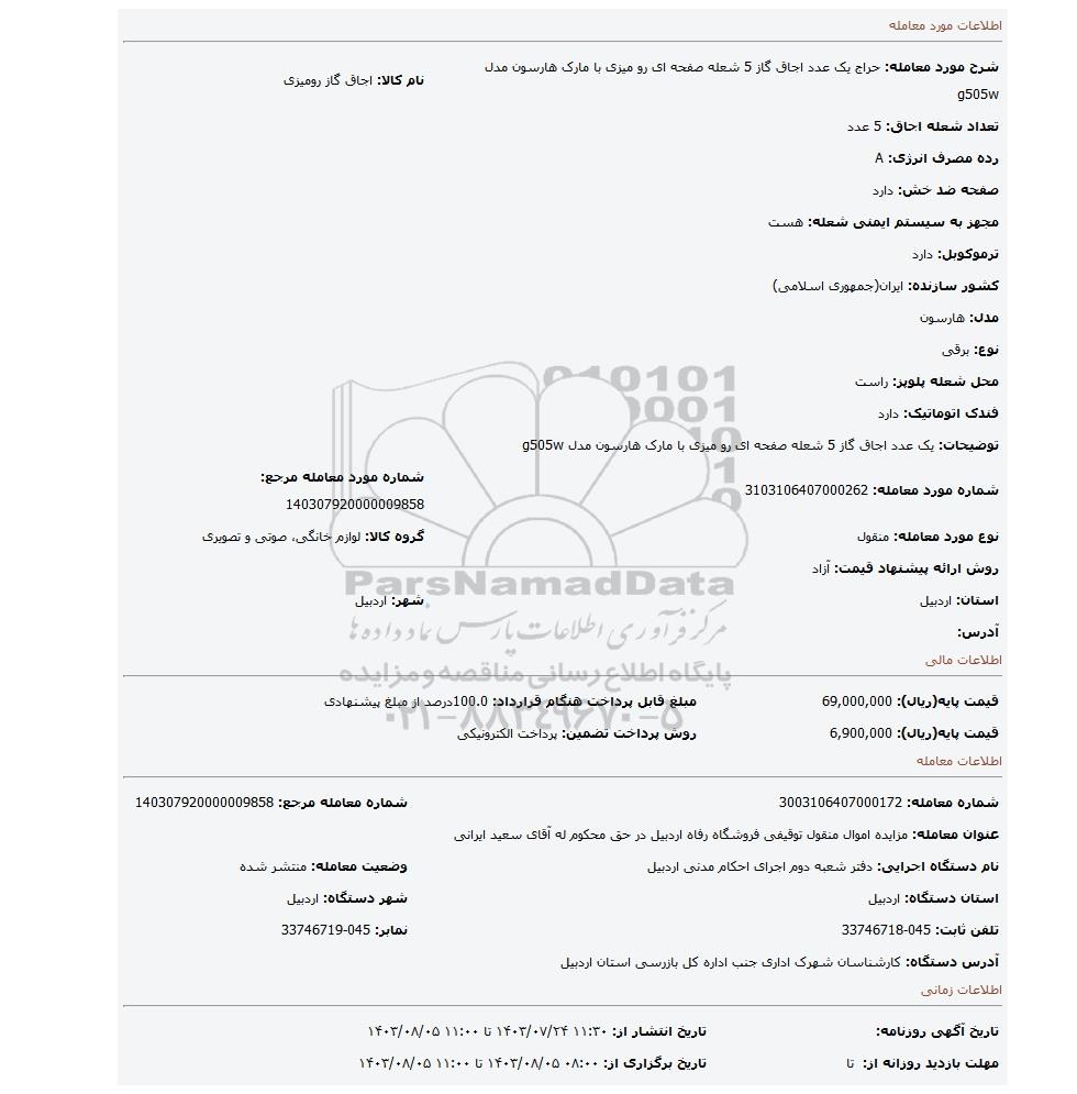 مزایده عمومی مزایده یک عدد اجاق گاز 5 شعله صفحه ای رو میزی با مارک هارسون مدل g505w برگزار میگردد. از کلیه افراد متخصص و شرکتهای واجد شرایط دعوت به عمل میآید تا در این مزایده با کد خبرگزاری پارس نماد : 8137998 شرکت نمایند تاریخ شروع مزایده : 1403/07/24 مهلت شرکت در مزایده: تا پایان روز 1403/08/05