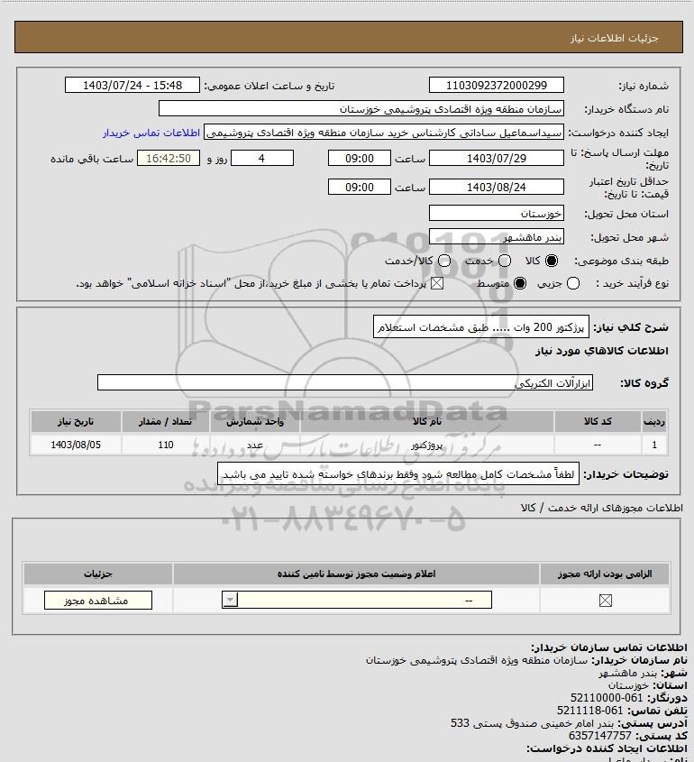 شرح کلی نیاز: پرژکتور 200 وات ..... طبق مشخصات استعلام