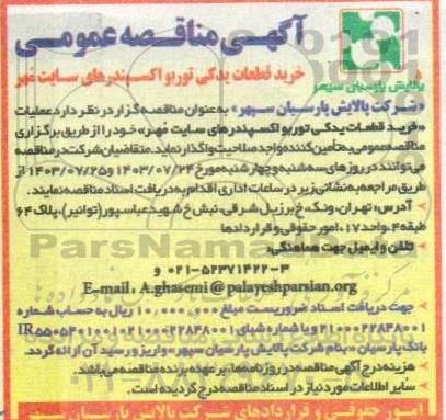 مناقصه عمومی خرید قطعات یدکی توربو اکسپندرهای سایت مُهر از کلیه افراد متخصص و شرکتها واجد شرایط دعوت به عمل میآید در مناقصه با کد خبرگزاری پارس نماد: 8139937 شرکت نمایند.