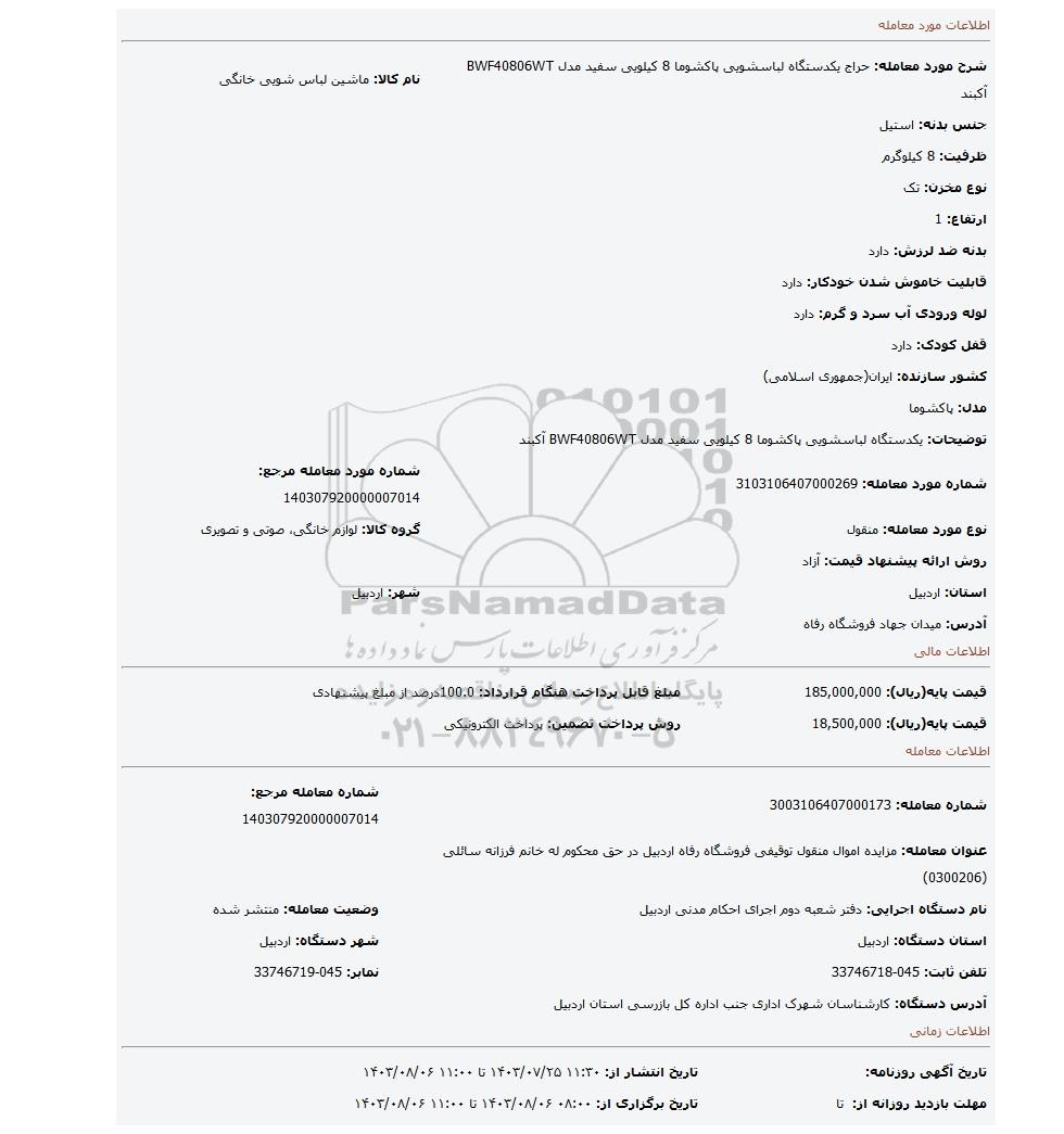 شماره مورد معامله: 3103106407000269 | شماره مورد معامله مرجع: 140307920000007014 | |