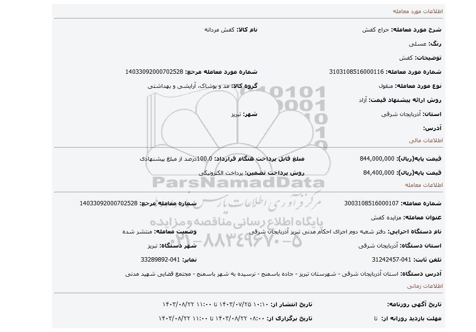 | شرح مورد معامله: حراج کفش | نام کالا: کفش مردانه | |