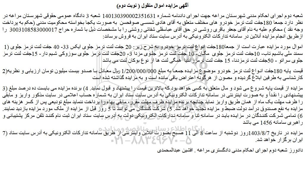 شعبه دوم اجرای احکام مدنی شهرستان مراغه جهت اجرای دادنامه شماره 140130390002351631 شعبه 3 دادگاه عمومی حقوقی شهرستان مراغه در نظر دارد جمعا 180جفت لنت ترمز خودرو های مختلف متعلق به آقای هادی شمسی صوفحسن  به صورت یکجا بخواسته محکومیت مدنی (حکم به پرداخت وجه نقد ) محکوم علیه به نام آقای جعفر باقری روشی در حق آقای عباسقلی شفائی روشتی را با مشخصات ذیل با شماره حراج 3003108583000017  را ازطریق انجام مزایده آنلاین در سامانه تدارکات الکترونیکی به آدرس سایت ستاد ایران به فروش برساند:
