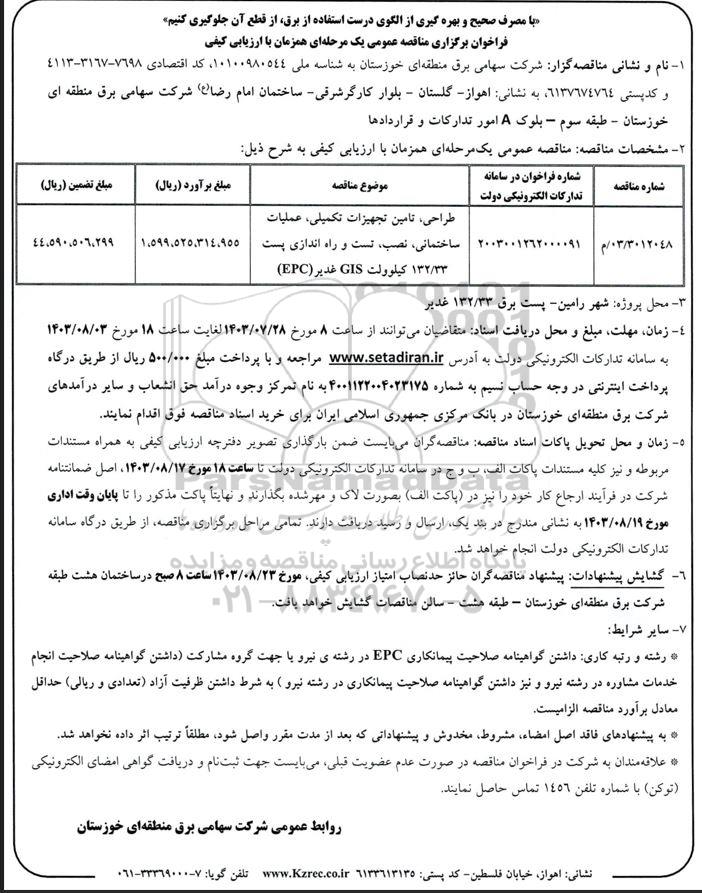 03/3012048/م | 2003001262000091 | طراحی، تامین تجهیزات تکمیلی، عملیات ساختمانی، نصب، تست و راه اندازی پست 132.33 کیلوولت GIS غدیر (EPC) | 1.599.525.314.955 | 44.590.506.299 |
