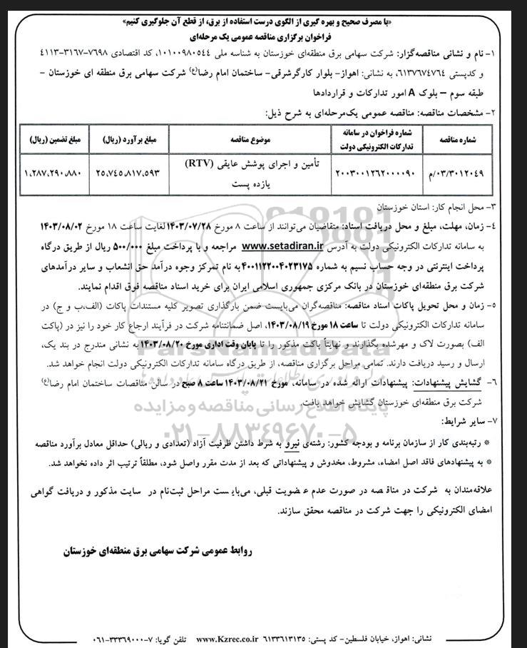 1- نام و نشانی مناقصه گزار: شرکت سهامی برق منطقه ای خوزستان به شناسه ملی 10100980544 کد اقتصادی 7698 - 3167 - 4113 و کد پستی 6137674764 به نشانی: اهواز - بلوار کارگر شرقی - ساختمان امام رضا (ع) شرکت سهامی برق منطقه ای خوزستان - طبقه سوم - بلوک A امور تدارکات و قراردادها