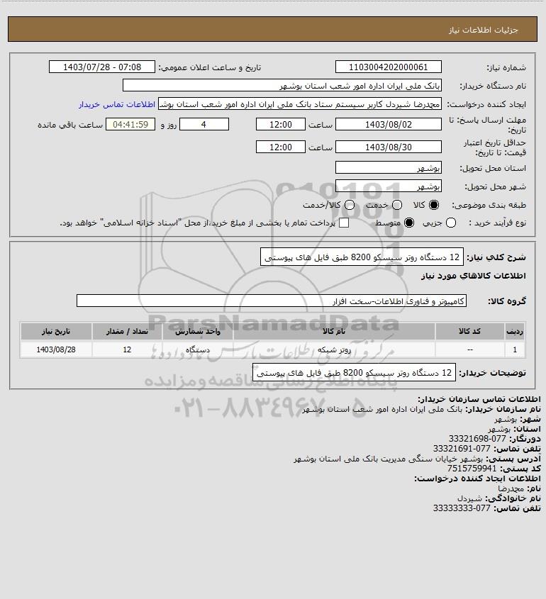 شرح کلی نیاز: 12 دستگاه روتر سیسکو 8200 طبق فایل های پیوستی